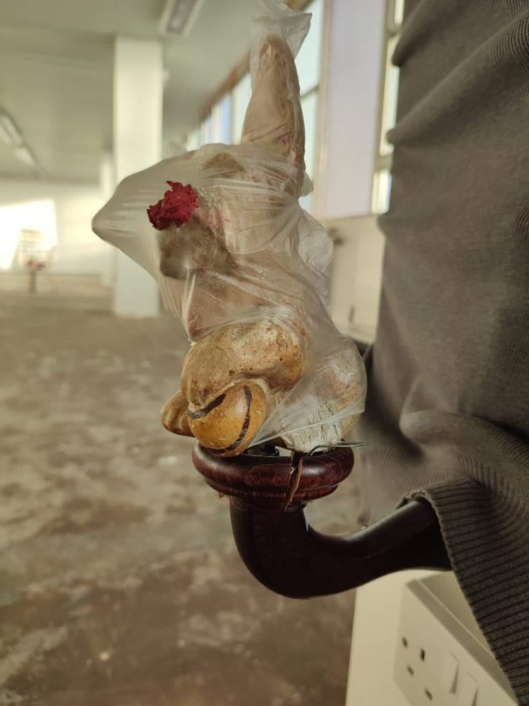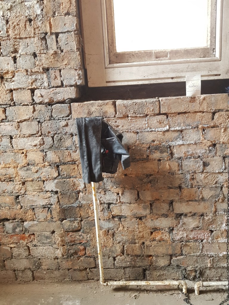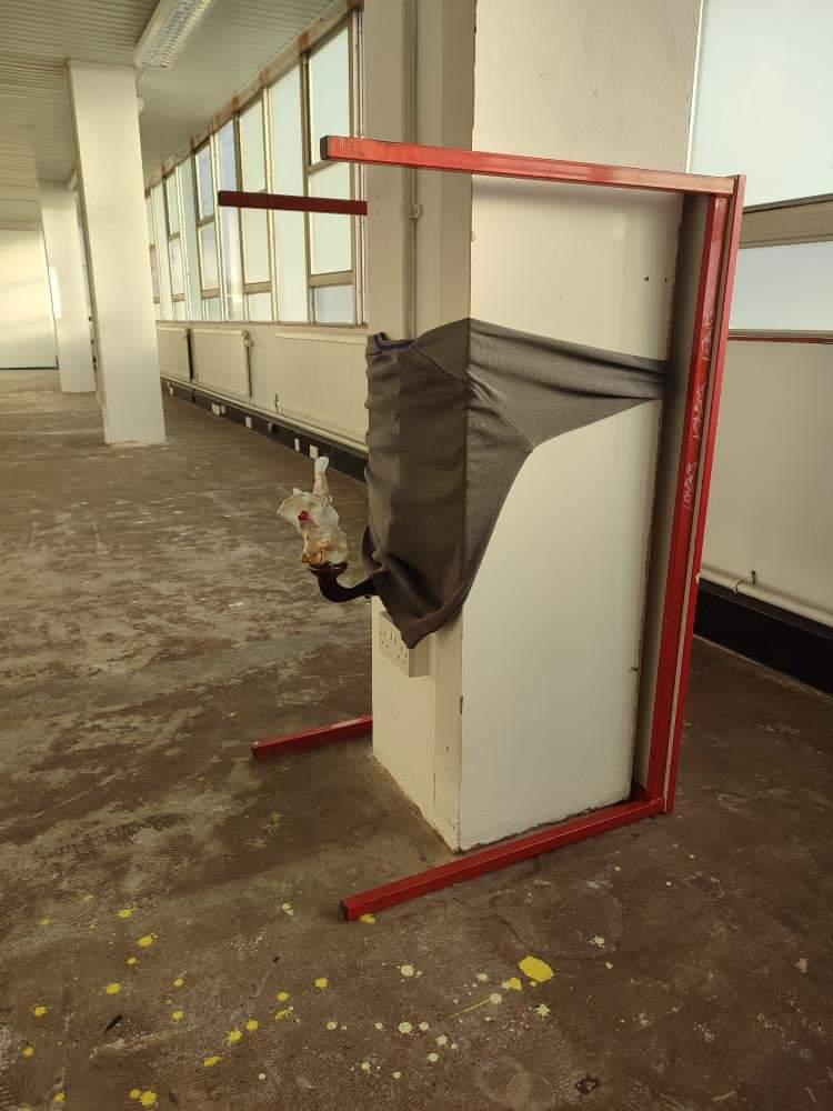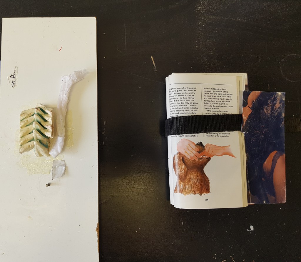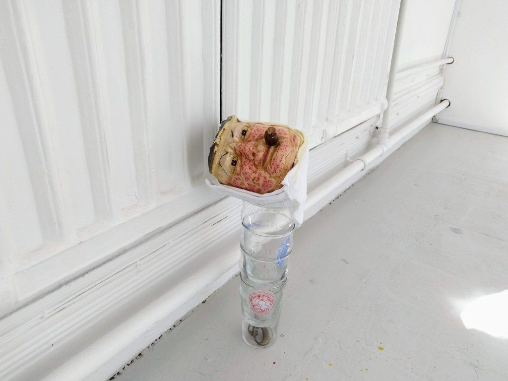 Untitled, dog ornament, disposable glove, school jumper, lipstick, pub light fixing