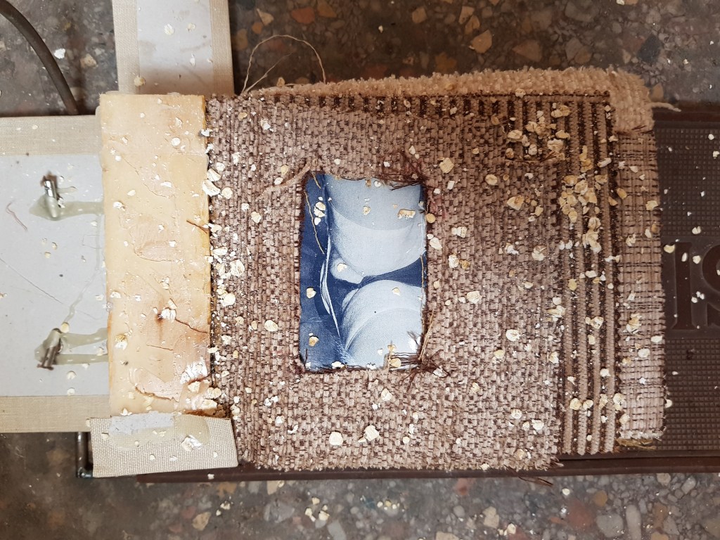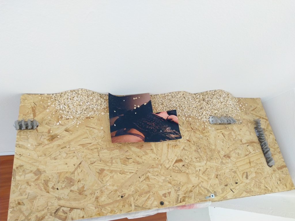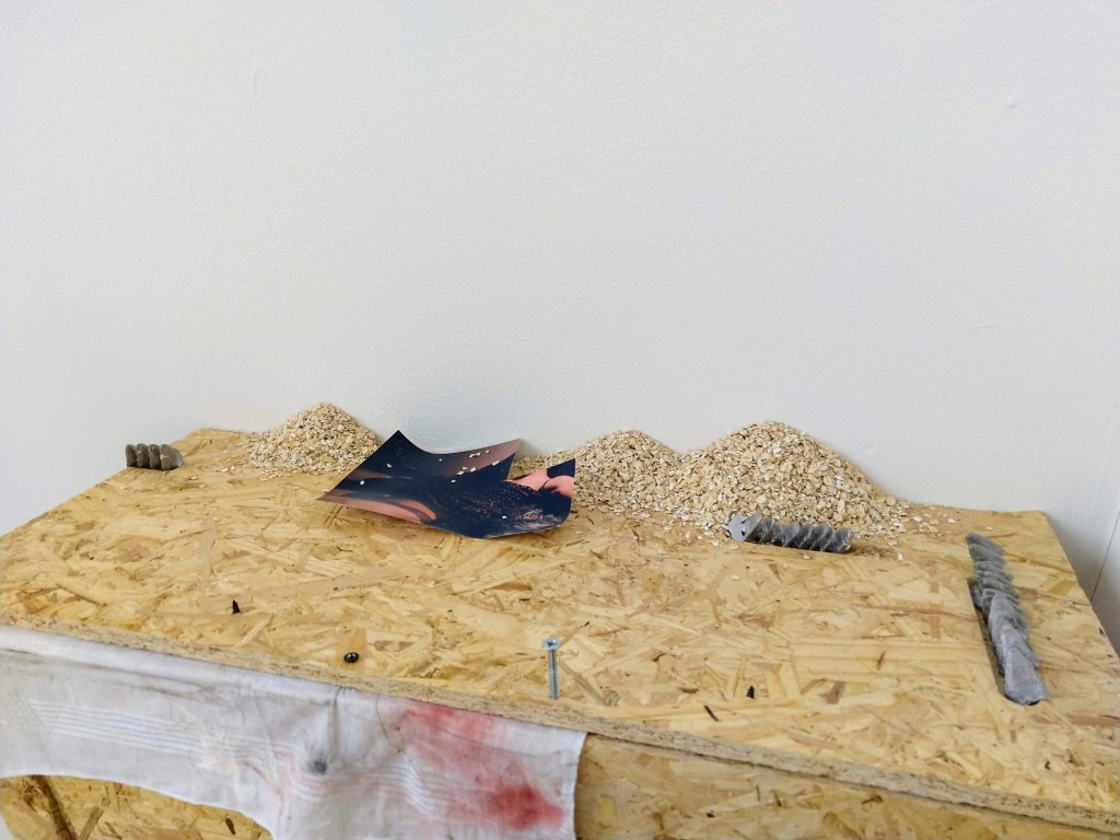 Don’t tell mother, carpet samples, c-type print, steel, oats, rubber sewing mat