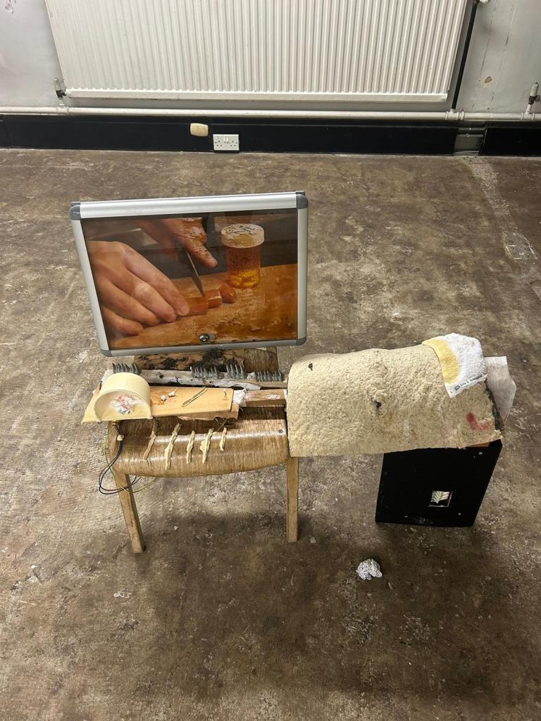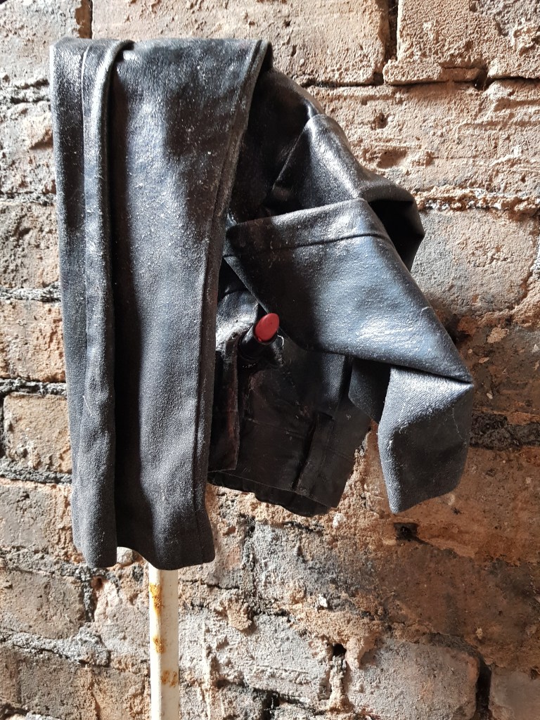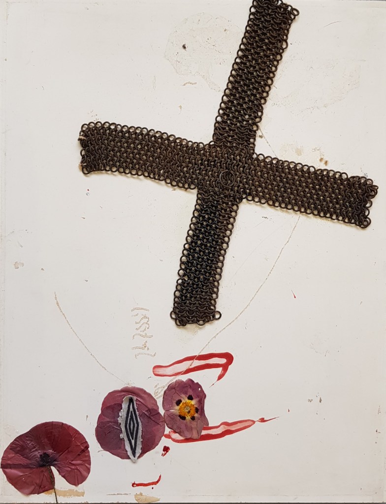 oh boy, handmade chain mail, dried poppies, umbro embroidered logo, fake blood, plaster board