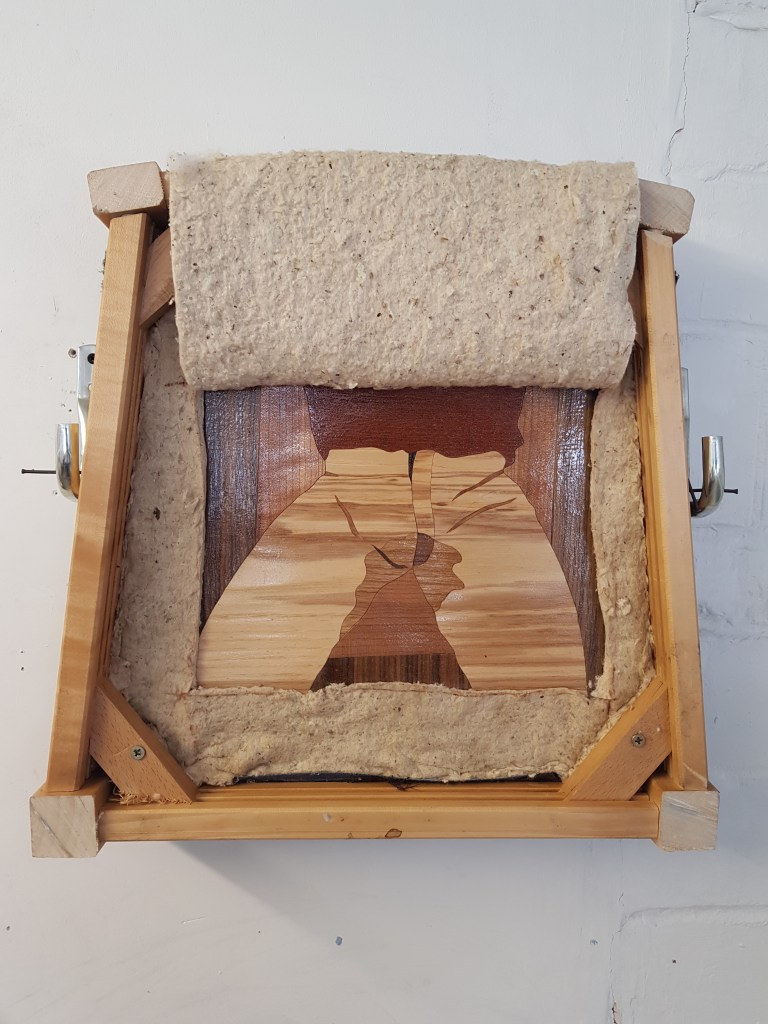 Post or Pre AA meeting on handmade bird box, 2024 mixed wood, cloth, wax, found basket, nails