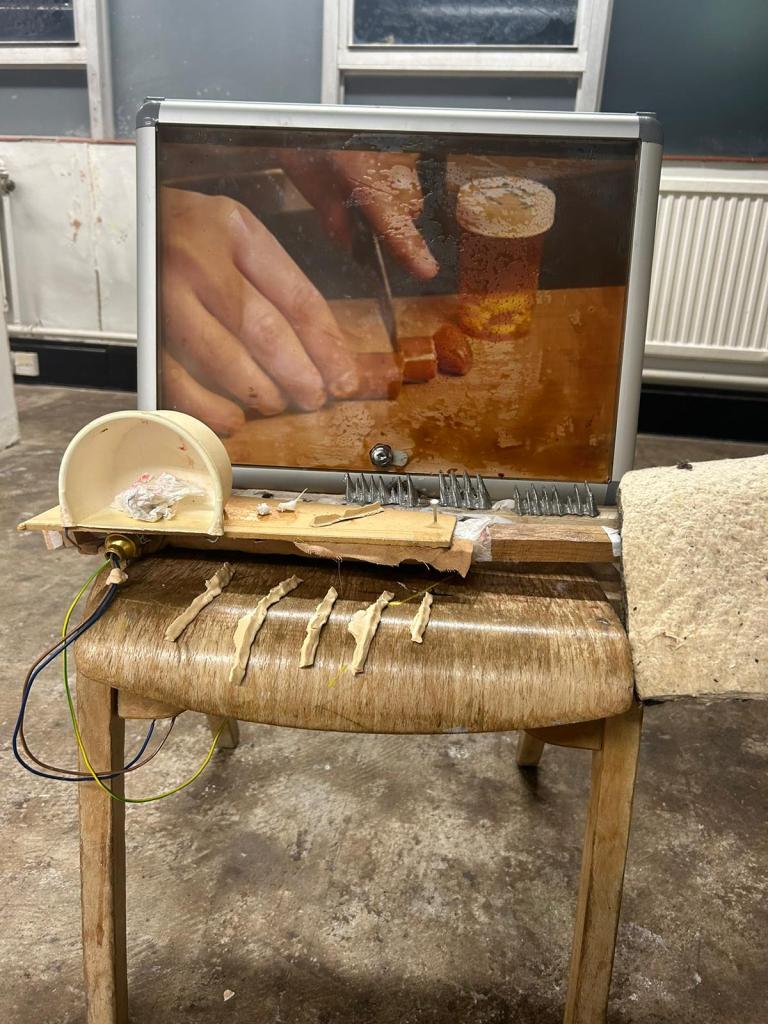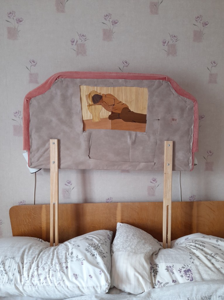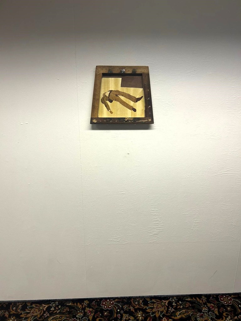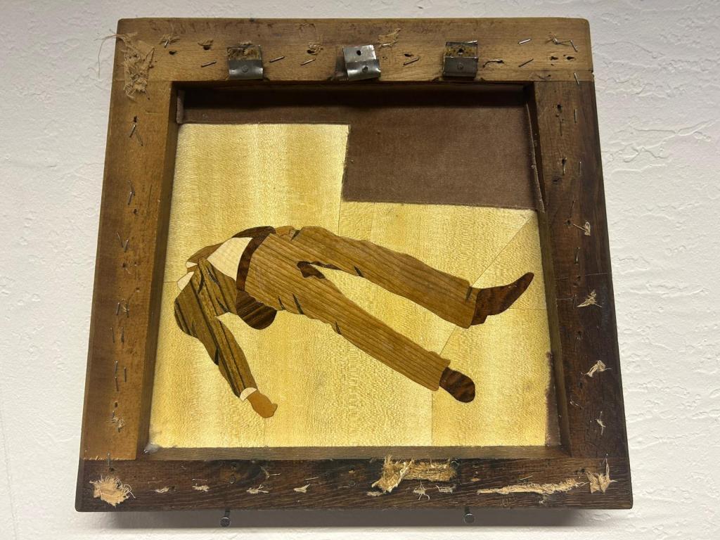 piss pants, 2022, mixed wood, varnish, framed in pub stool