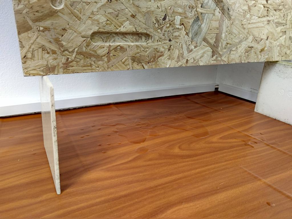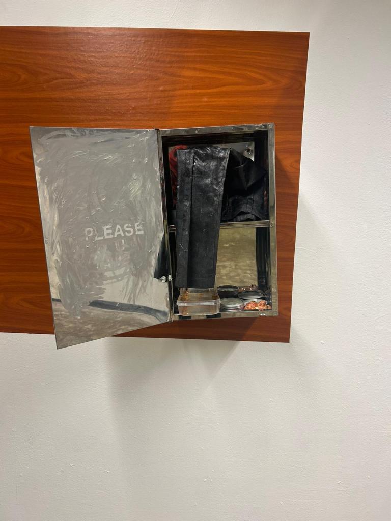 Untitled, mirror cabinet, hair wax, school trousers, resin, ceramics, used tupperwear