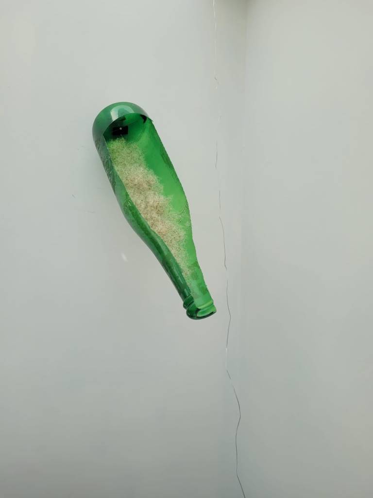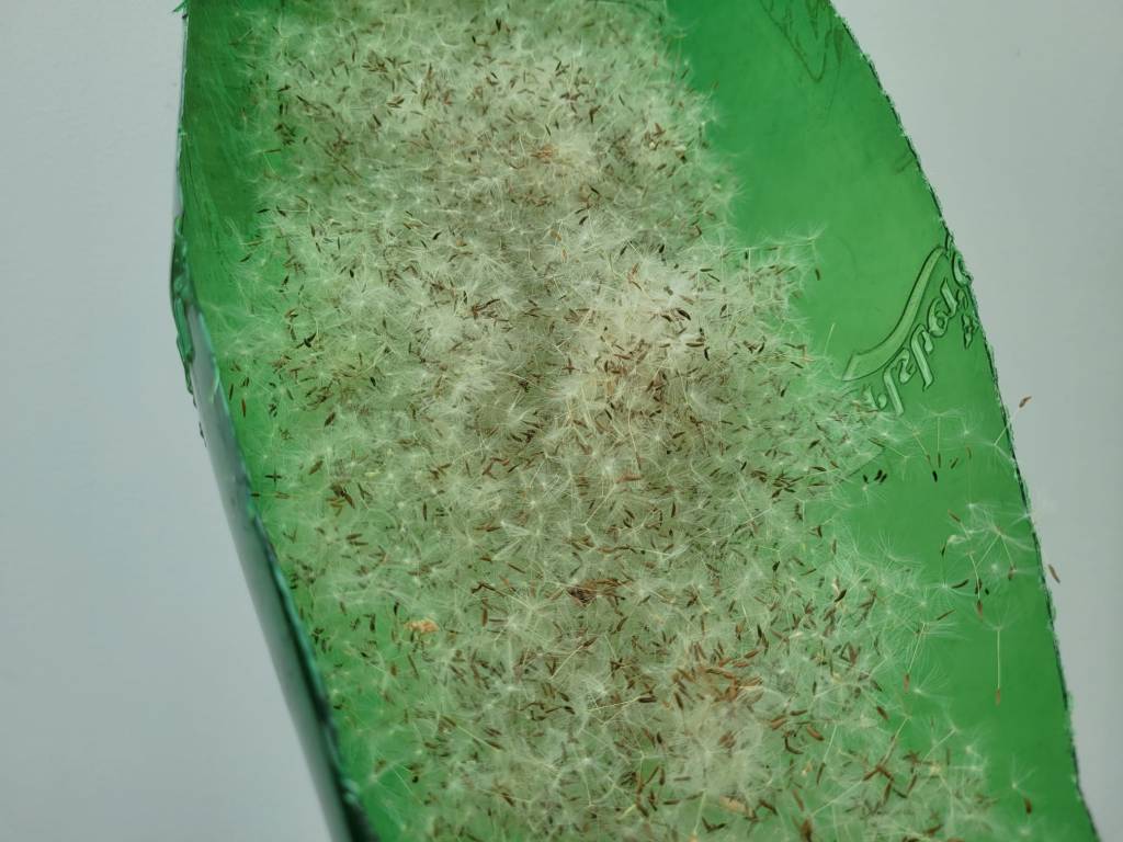Untitled, plastic beer bottle money box, dandelion seeds, fixings